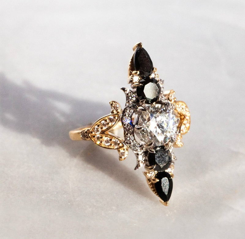 Bi-Color Sapphire Elvish & Crescent Moon Inspired Engagement Ring