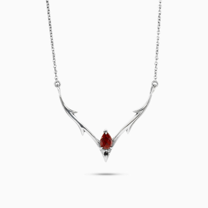 Valk Apex Pendant with a Pear-Shaped Garnet - This Valk Apex Pendant features two branches adorned with delicate thorns that meet in an apex V. Nestled in the point resides a rose-cut, pear-shaped Mozambique garnet above a round black spinel.