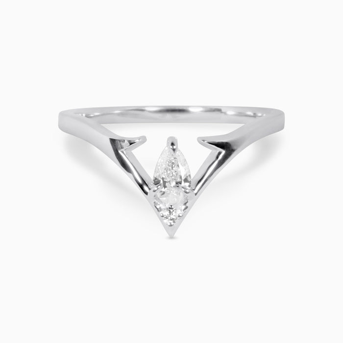 1. Valk Apex Ring with White Diamonds -The Valk Apex Ring features a branch-like chevron meeting in an apex V. At its center sits a pear-shaped white diamond above a round white diamond.